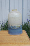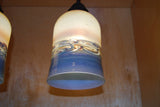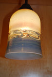 This color pattern is one of our most popular! It is inspired by the ocean and the beach. Even if you don't live on the coast these will make you feel like you do. The top is a warm, light amber color when lit and the bottom is blue. The center has butterscotch and blue swirls. It is 7 1/2" tall and 5 1/2" wide, our regular size in the barrel shape Choose from a dark bronze or satin nickel 4ft adjustable pendant kit. 100 watt bulb.