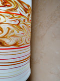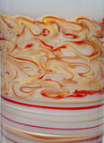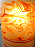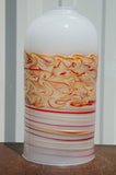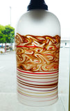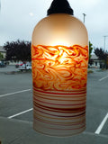 This warm white and red light is functional, beautiful and fun. Create a more decorative look for your bathroom vanity or bright task lighting for the kitchen. This listing is for our large barrel shaped shade, 10 inches tall and 5 inches accross. There are butterscotch and red swirls and lines, that emit a soft, warm, illuminated glow when lit, and a unique, eye-catching design when unlit. This shade is made for the 4ft" adjustable rigid rod pendant kit; 100 watt bulb. Choose from dark bronze, or brushed nickel. Made from thick, sturdy Borosilicate glass. We can also make this shade for chandeliers and wall sconces also.