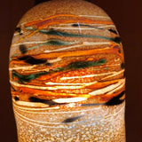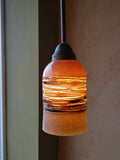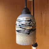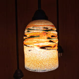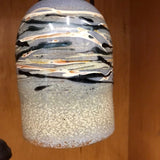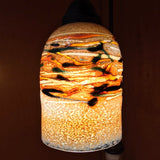 This glass pendant light was inspired by the Northern California Coast. A local customer wanted their lights to look like agates. And this is what was created! This is a barrel, shape shade 8" tall & 5" wide It is created with amber powder glass which changes on and off! Off is a dark grey, almost with a blue tone. And on, it's a orange like-butterscotch with tonal variations. There are butterscotch, black, and pearlescent dark blue lines. This shade is made for the 4ft" adjustable pendant kit (included). Choose from dark bronze, or brushed nickel. 100 watt bulb