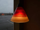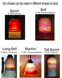 These red and light amber shades give off a super, warm glow! And add the perfect pop of red to a space. They are created using a powdered glass that has gold, beige and amber tones when the light is on. When the shades are off the are a sandy beige. These colors are warm and look great with any wood finish. There are black and white swirls and lines. *( Colors can be changed) Made from handblown borosilicate glass. That means it is extra sturdy and shock resistant. This is a Martini Shape 7" tall 7"wide ( The size and shape can be changed) Choose from a dark bronze or satin nickel 4ft adjustable pendant kit. 100watt