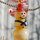 Our hanging glass snowman has become a Christmas favorite! Made from thick, sturdy, shock resistant borosilicate glass. This snowman has a Red hat, Blue scarf and an Orange nose. And there has been a process done to the glass that makes them gold. Very festive, they sparkle. They are about 4 1/2" tall and 1/2" across. There is a hole on the bottom that is perfect for a tree light. *You can request different colors for the scarf and hat