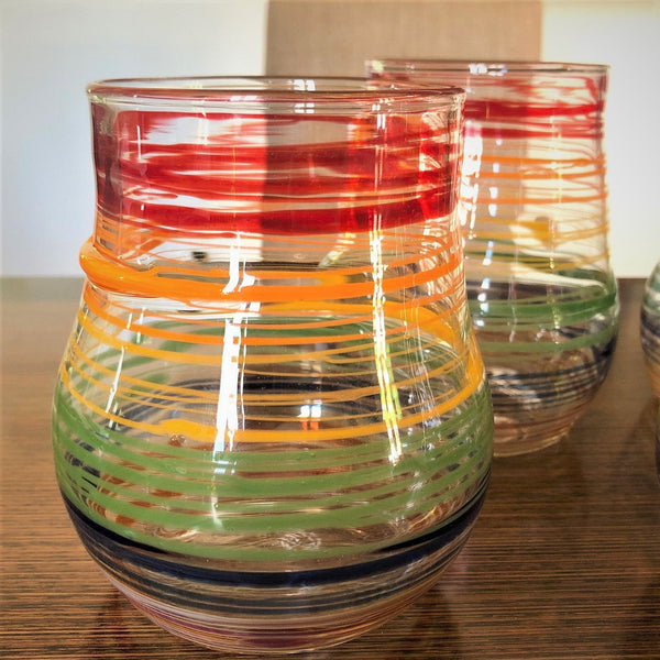 These handcrafted rainbow stemless wine glasses can hold over 20 ounces, and are molded nicely to fit your hand. All items are crafted with love and care in the Hudson Valley, New York. The glass used is Schott Duran Borosilicate, which is the highest quality, scientific grade glass available. What this means to you, is that all Mirador Glass products are remarkably durable-- dishwasher and microwave safe, in addition to being non-reactive and lead free! These fun, colorful glasses measure approximately 3" diameter at the mouth, 5" in height, and 4" at the widest point. Each glass is handmade, so subtle variations will occur. Sets are available, but listing price is per glass.