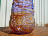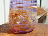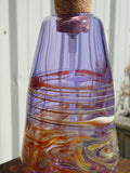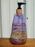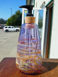 This soap dispenser is made entirely of gorgeous purple glass! The amber and butterscotch swirls and lines add dramatic flair, unlike anything  you'd find at Bed Bath and Beyond! Each one is individually hand crafted, using high quality borosilicate glass, this means they are durable and shock resistant enough to use in kitchen and bathroom settings (but be careful- it is still glass!).  These dispensers hold between 12-14 oz of liquid soap (or get creative and pump out mouthwash, supplements, lotion).  We have had customers tell us they like to experiment with different colored liquid soaps to enjoy varied effects. The cork pump is easily replaceable.  If you decide to switch uses, no problem, just pop in the dishwasher and it will be clean as new.