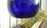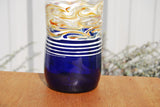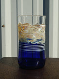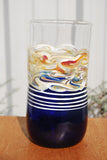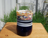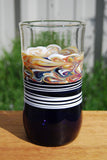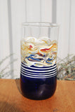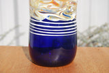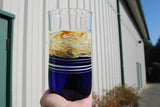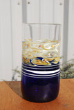 This is the one for a cobalt glass collector! Half the glass is cobalt and the other is clear. The center is bright white trails leading up to butterscotch and white swirls. These glasses are thick and heavy. Made borosilicate glass, making it dishwasher, microwave and freezer safe . Approx 6" tall, about 3 1/4 " across. Holds 16oz. Have more made to match! We will ship internationally, send a message.