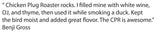 The chicken fat drips away as the bird is instantly marinated with your favorite flavors.