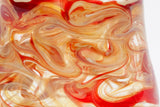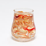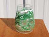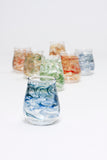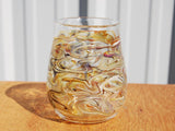 Our popular stemless wine glasses feel great in your hand. Fill with your favorite beverage and be transfixed by the gorgeous swirling patterns that encircle each individually made glass. These glasses come in a variety of colors, pick one or many! Each glass holds approximately 12 ounces and measures about 4 inches tall and 3 inches across-- although since they are individually hand made, slight variations may occur. In addition to being a nice ergonomic shape, these glasses offer intrigue when filled with different colored liquids, making certain colors appear more opaque or translucent.