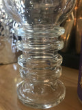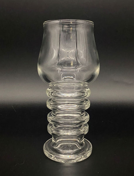 Here's another one-of-a-kind craft beer glass, perfect for the beer connoisseur. Bryan Raskin creates approachable functional art for collectors who love to drink from sculptural glass. This glass features four heavy duty glass rings along the barrel of the glass, enhancing carbonation as it flares to a tulip shaped bowl. This glass holds 400ml, approximately 14 ounces. It is 8" tall, at 2.5 at the mouth. As with all Mirador Glass products, this piece is crafted from Schott Duran borosilicate glass, which is dishwasher safe, non-reactive, durable, and easy to care for.